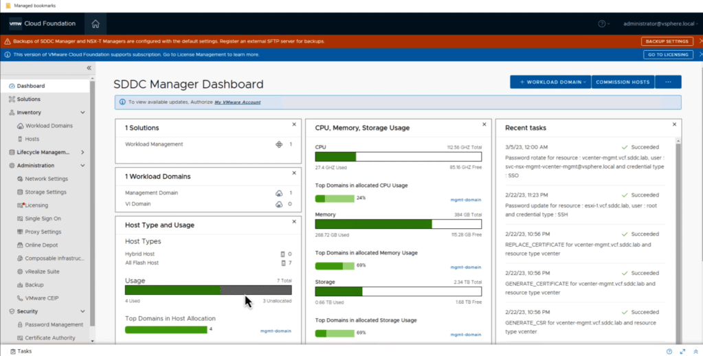 Minimum HW prerequisite for VCF are 4 nodes for the management domain, as well as a dedicated workload domain with a minimum of 3 hosts. Yes, you can use your management domain as workload domain, but if you don’t want to mix up mgmt and production, or for security reasons want to have this separate, then a split would be the way to go. If you don’t have 4 or 7 servers available in your lab, what then? Well, you could install Holodeck on ONE server instead with some nested esxi servers and vms..