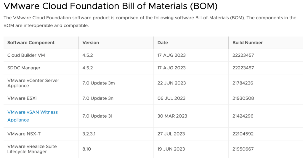If you take a look at the release notes for VCF and cloudbuilder 5.0 which is the recommended version in Holokit 2.0, you see a section called “Bill of materials BOM”: