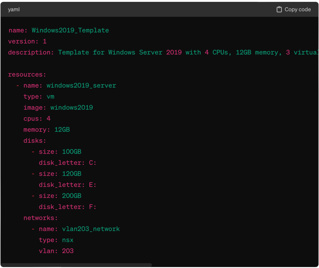 Ensure to adjust the disk sizes, drive letters, and network details according to your requirements. Once you have saved this YAML configuration file, you can use it to create the template in Aria Automation Cloud.