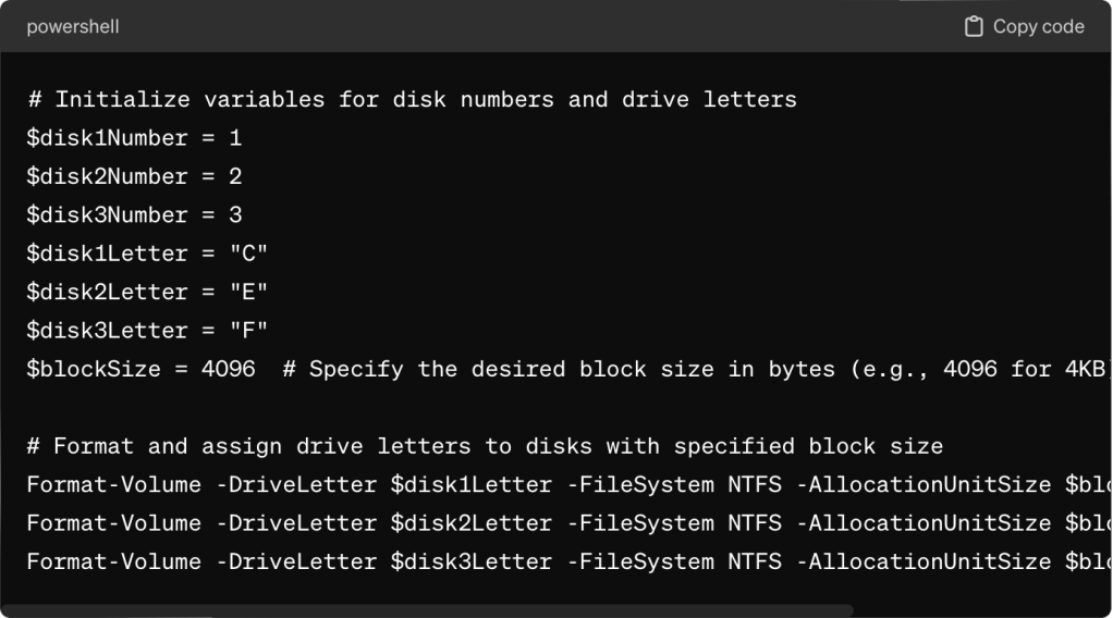 Format-Volumecmdlet to format the volumes of the disks and assigns the desired block size using the-AllocationUnitSizeparameter. - The