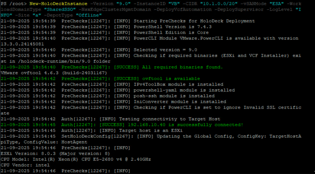New-HoloDeckInstance -Version “9.0” -InstanceID “VB” -CIDR “10.1.0.0/20 -vSANMode “ESA” -WorkloadDomainType “SharedSSO” -NsxEdgeClusterMgmtDomain -DeployVcfAutomation -DeploySupervisor -LogLevel “INFO” -Site “a” -DepotType “Offline”