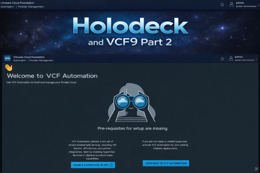 New-HoloDeckInstance -Version "9.0" -InstanceID "VB" -CIDR "10.1.0.0/20 -vSANMode "ESA" -WorkloadDomainType "SharedSSO" -NsxEdgeClusterMgmtDomain -DeployVcfAutomation -DeploySupervisor -LogLevel "INFO" -Site "a" -DepotType "Offline"