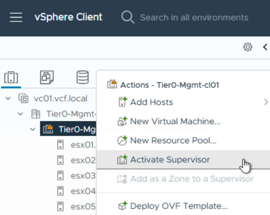 Now you can start the “activate Supervisor” by right clicking your cluster in the inventory in vcenter.