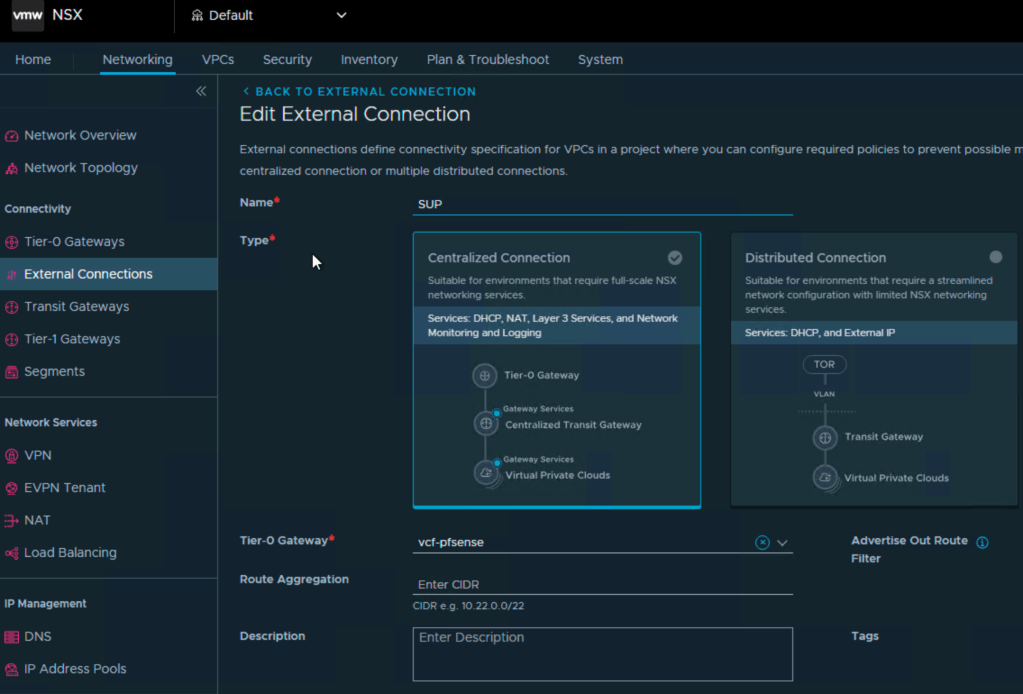 Here you connect the external connection you created in the previous step, the external IP block, connection to edge cluster and T0, but also the option to separate it with folders in vcenter and add to DFW.