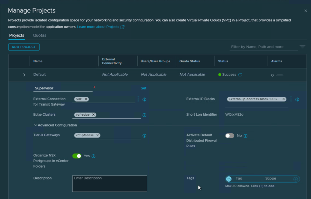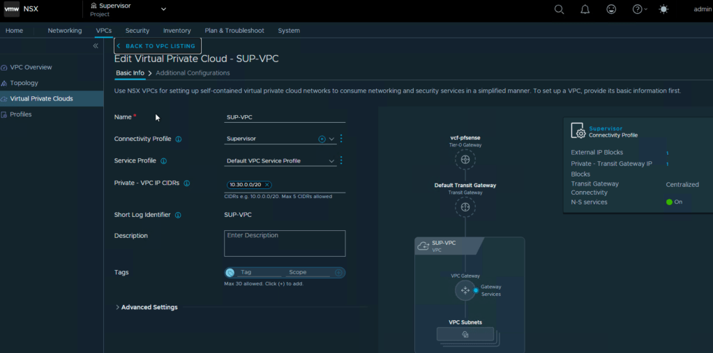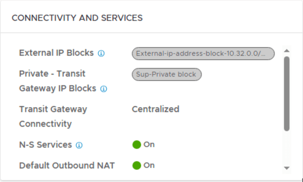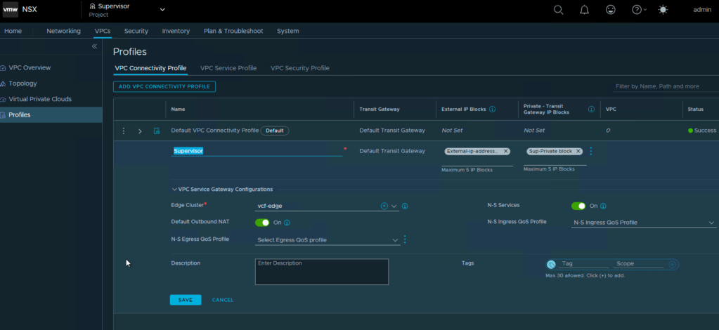 Here you see the NSX project we created, and also the VPC connectivity profile that gives us the external IP block and the private transit gateway ip block.