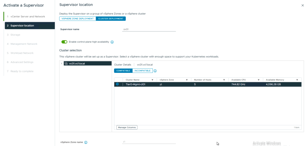 Next is the Supervisor name, cluster or zone, i chose cluster and set a zone name.