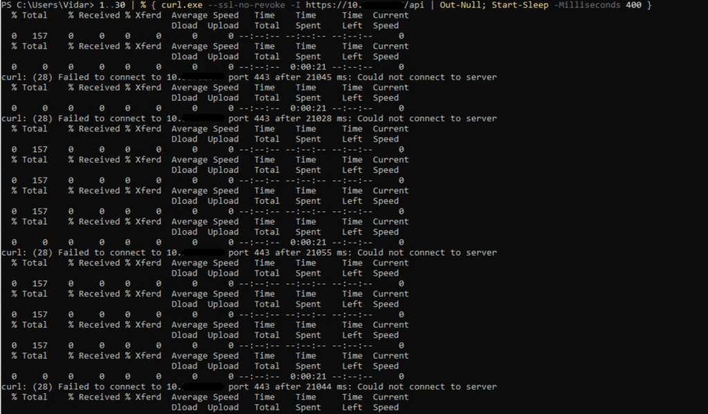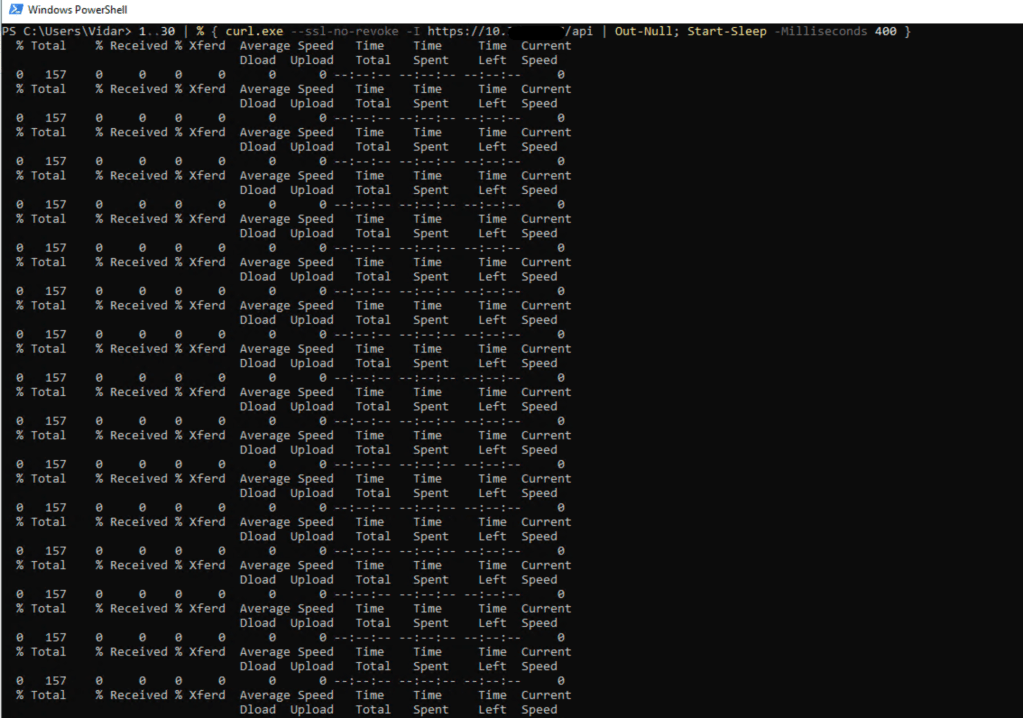 PS C:\Users\Vidar> 1..30 | % { curl.exe –ssl-no-revoke -I https://10.x.x.x/api | Out-Null; Start-Sleep -Milliseconds 400 }