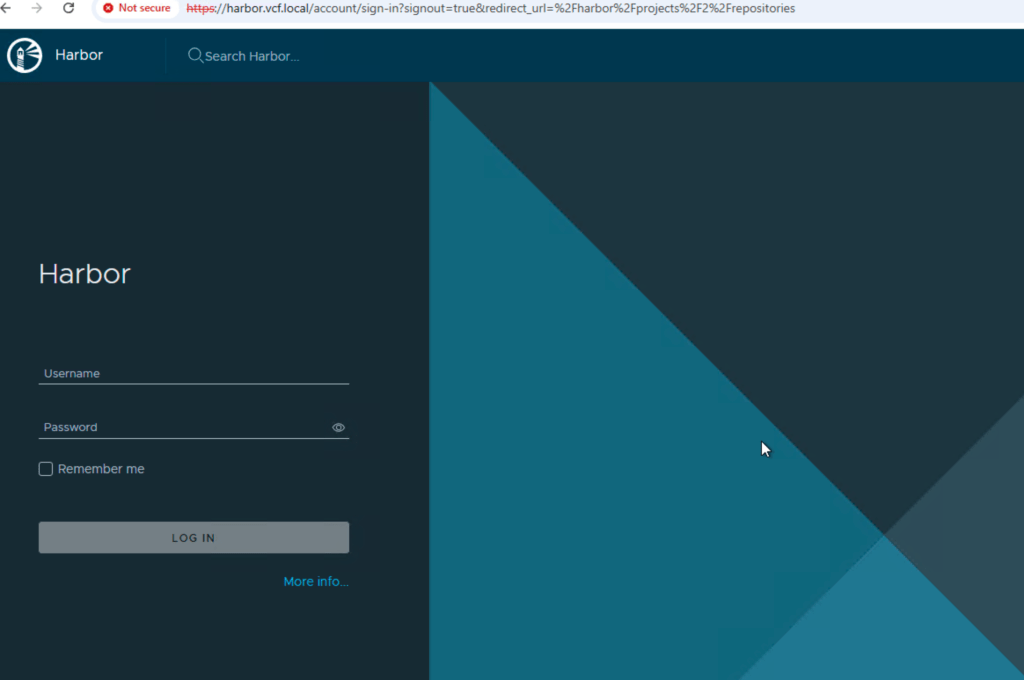 Use that for fqdn for harbor.vcf.local in DNS and your harbor portal should be available. Here you login with admin and the password that you configured in the data values yaml file.