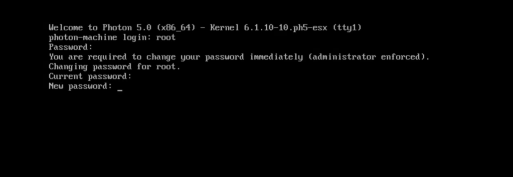 First i deploy a new Photon vm. I start a remote console in vcenter and log in with root. Default password for root is changeme, so change this the first time you log in.